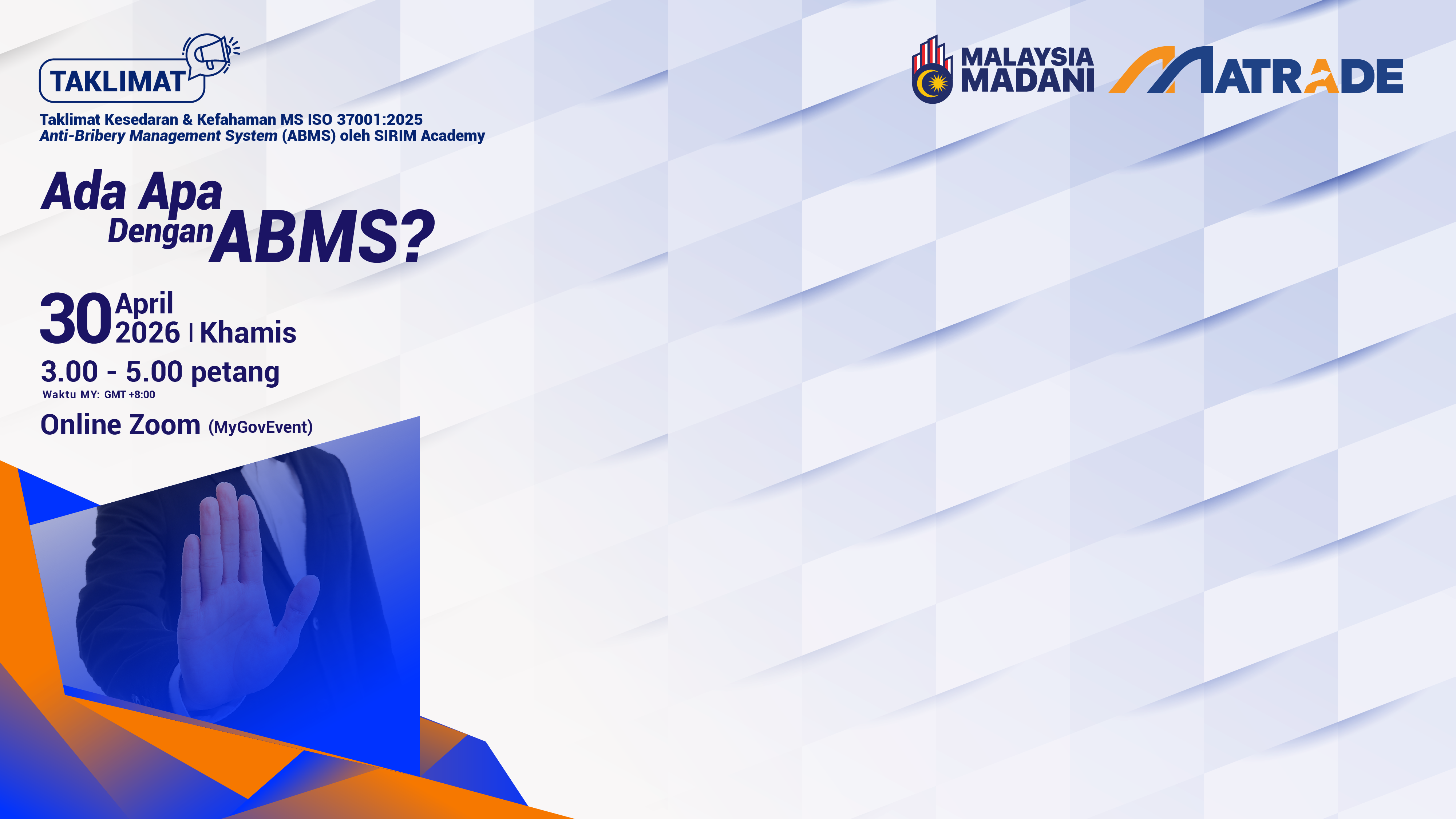 Objektif taklimat ini adalah untuk meningkatkan kefahaman warga MATRADE berhubung MS ISO 37001:2025 ABMS, isu rasuah, risiko yang berkaitan dan kepentingan pencegahan rasuah dalam organisasi.