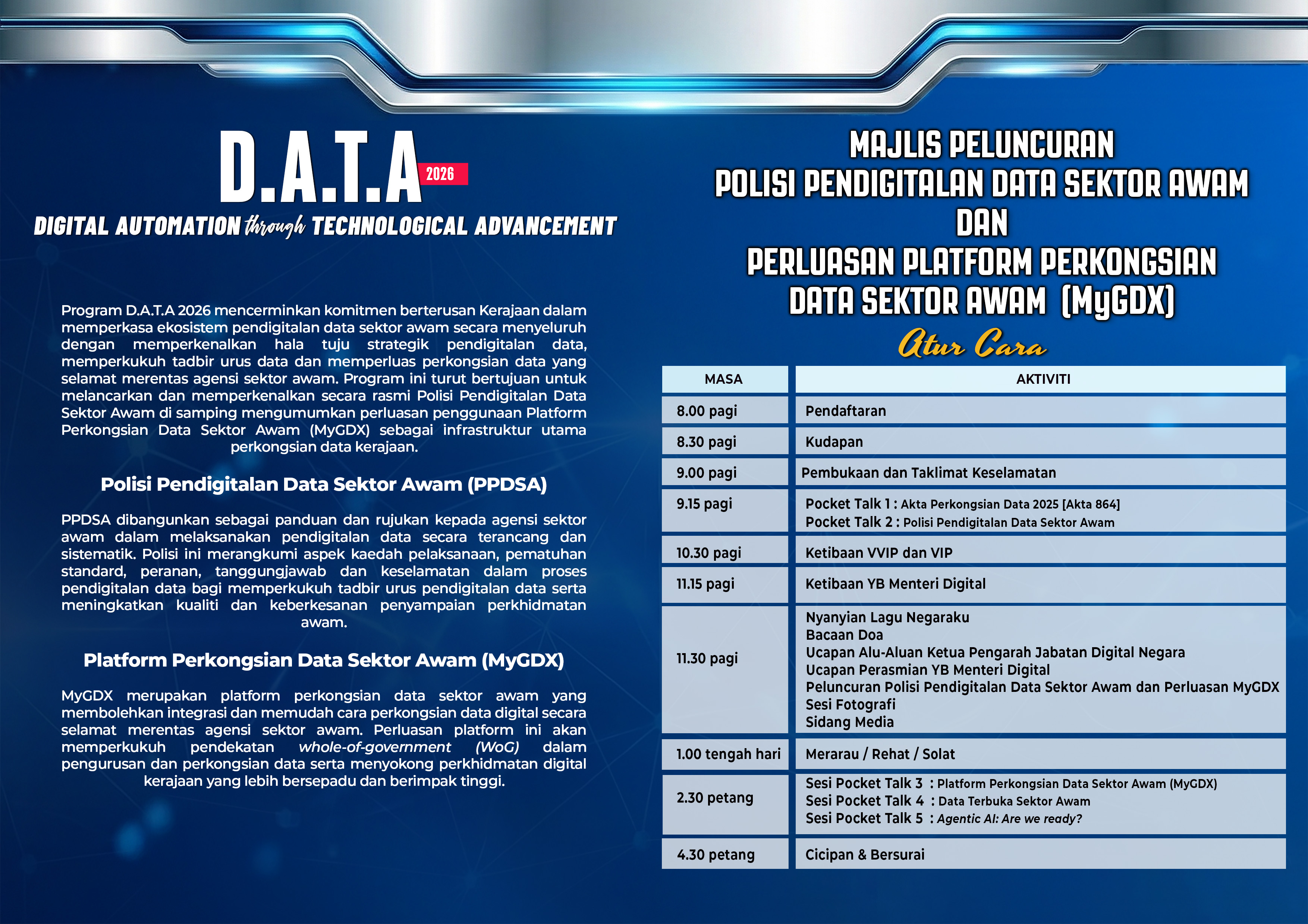 | MAJLIS PELUNCURAN POLISI PENDIGITALAN DATA SEKTOR AWAM DAN PERLUASAN PLATFORM PERKONGSIAN DATA SEKTOR AWAM (MALAYSIAN GOVERNMENT CENTRAL DATA EXCHANGE) |