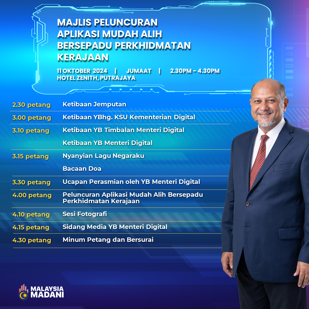 Bagi merancakkan perluasan perlaksanaan aplikasi ini ke seluruh perkhidmatan agensi kerajaan boleh dinikmati dan dimanfaat oleh Rakyat, majlis peluncuran aplikasi ini akan disempurnakan oleh YB Tuan Gobind Singh Deo, Menteri Digital.