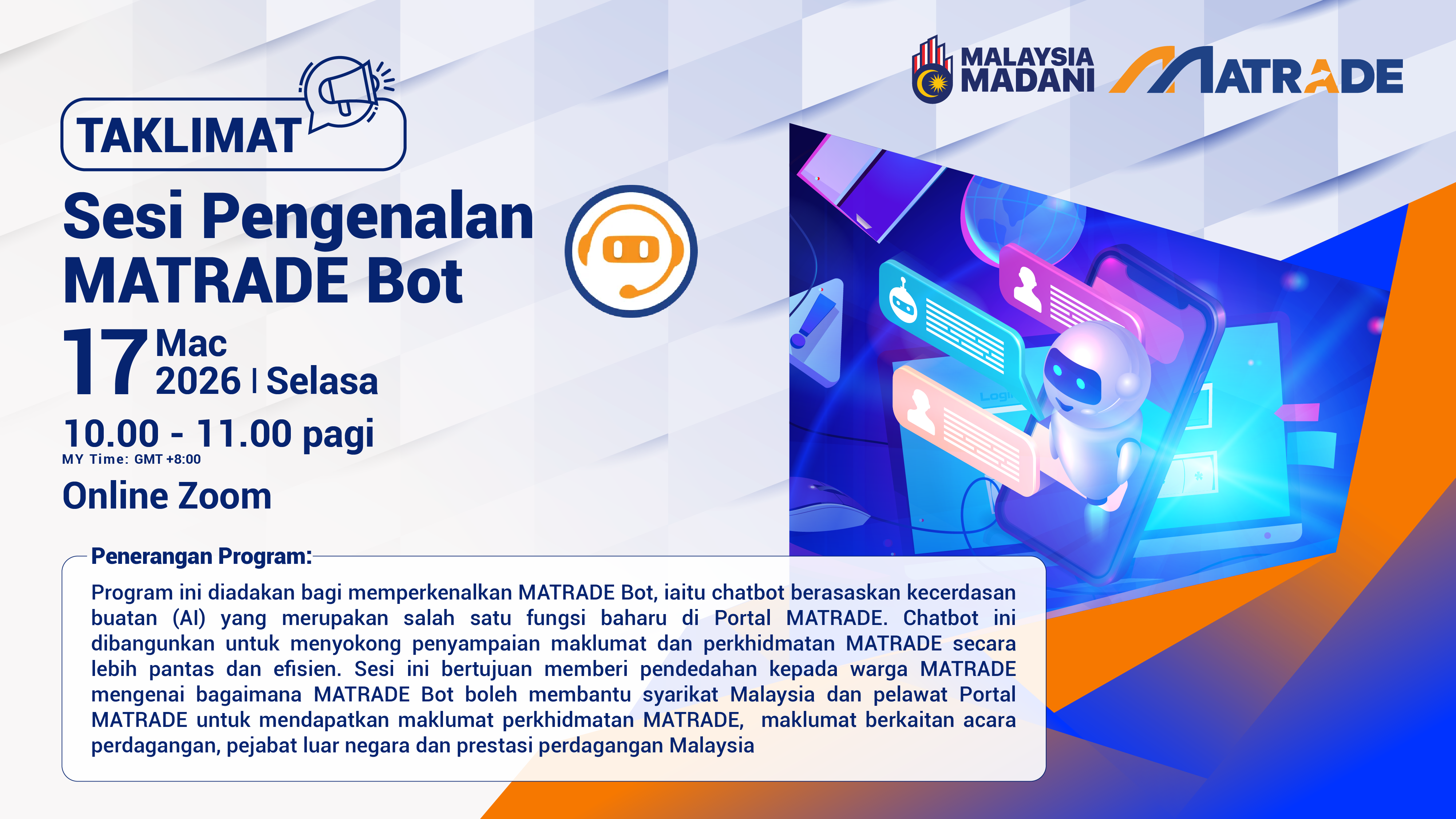 - Memberi pendedahan kepada warga MATRADE mengenai fungsi dan keupayaan MATRADE Bot sebagai chatbot berasaskan kecerdasan buatan (AI) di Portal MATRADE.