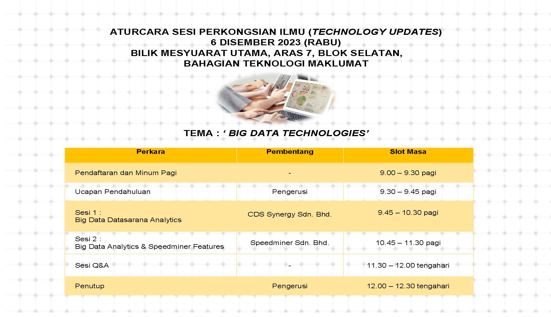 Sesi perkongsian ilmu berkaitan teknologi ICT terkini dari pihak syarikat. Tema yang dipilih kali ini ialah ‘ BIG DATA TECHNOLOGIES’.