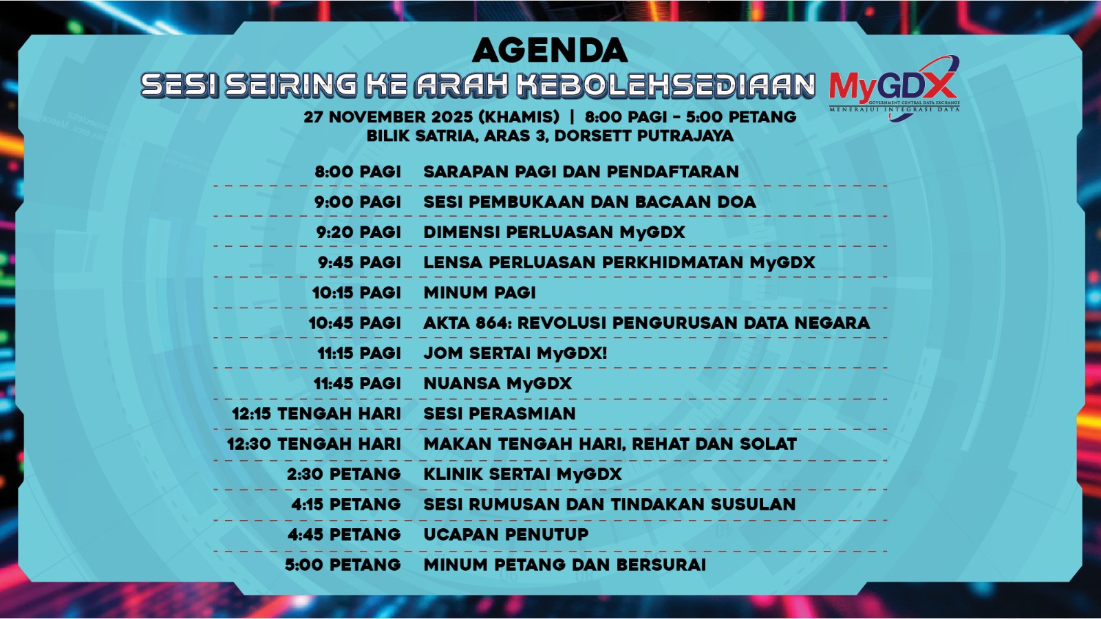 Justeru, Sesi Seiring Ke Arah Kebolehsediaan MyGDX dilaksanakan sebagai langkah untuk memudahcara pelaksanaan MyGDX di kementerian dan agensi mencapai mencapai status MyGDX Ready dalam tempoh lima (5) bulan