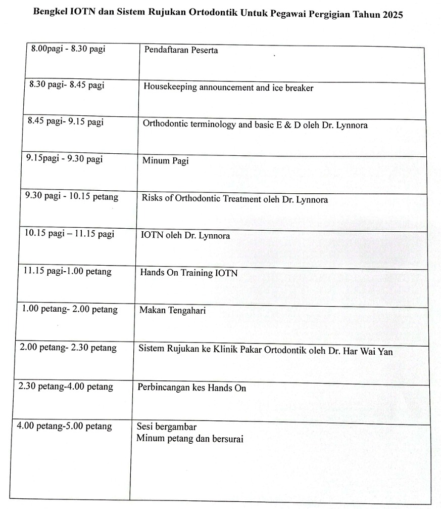 Memberi pendedahan dan informasi kepada pegawai pergigian agar dapat memberikan diagnosis ortodontik yang betul terutama mematuhi IOTN agar risiko pemakaian aplians ortodontik dapat dielakan atau dikurangkan (more benefit than the risk) serta penekanan kepada pematuhan garis panduan KKM berkenaan dengan sistem rujukan ke premis kerajaan.