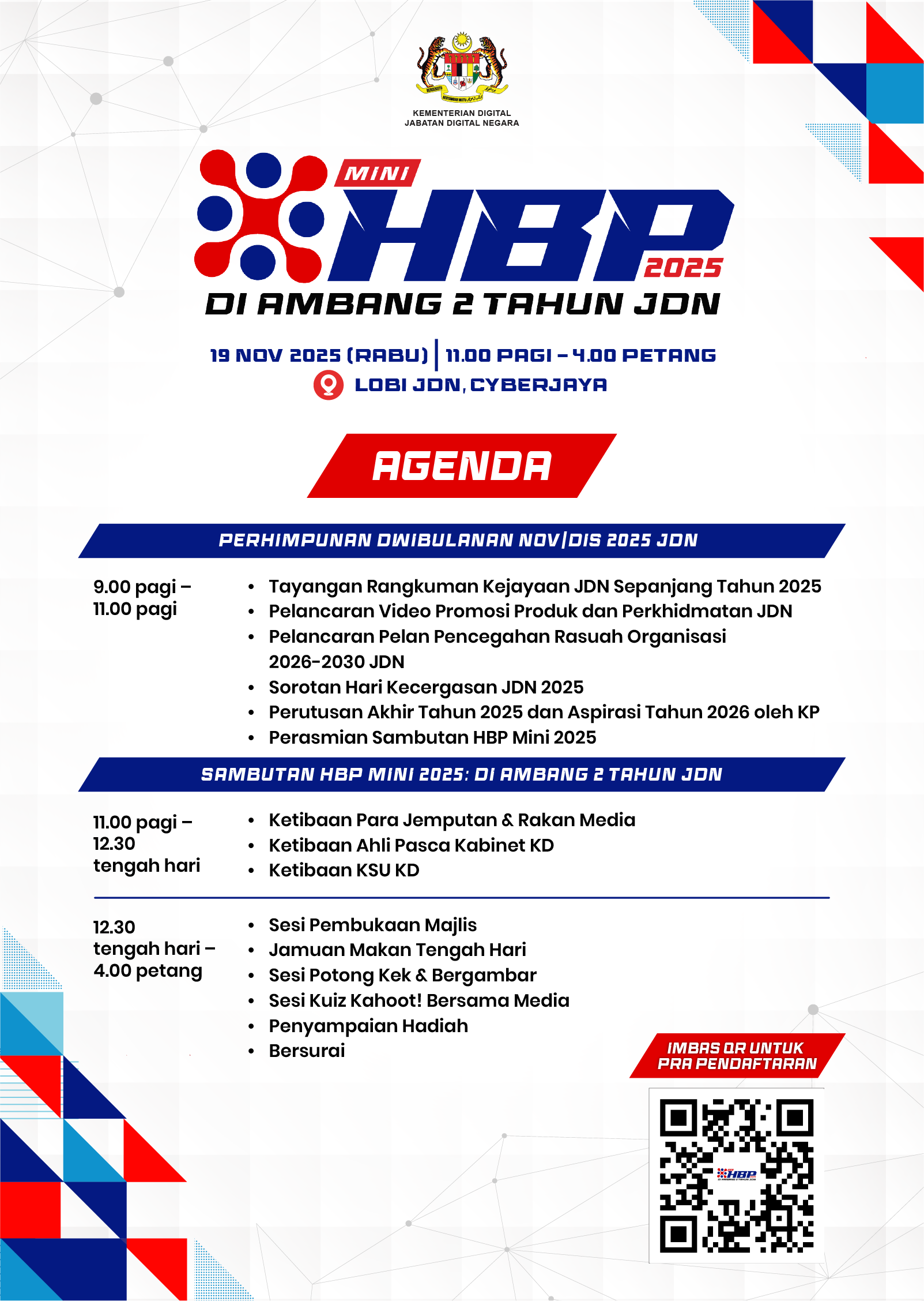 Program tahunan Hari Bertemu Pelanggan (HBP) di peringkat Jabatan yang kali ini berskala kecil dan tertumpu kepada warga Jabatan Digital Negara (JDN), Kementerian Digital serta Jabatan/Agensi di bawahnya. HBP Mini 2025: Di Ambang 2 Tahun JDN akan menampilkan gabungan 4 komponen termasuk pelancaran serta sesi apresiasi warga JDN di atas sumbangan dan peranan sepanjang tahun menuju ulang tahun ke-2 pada 12 Disember ini.