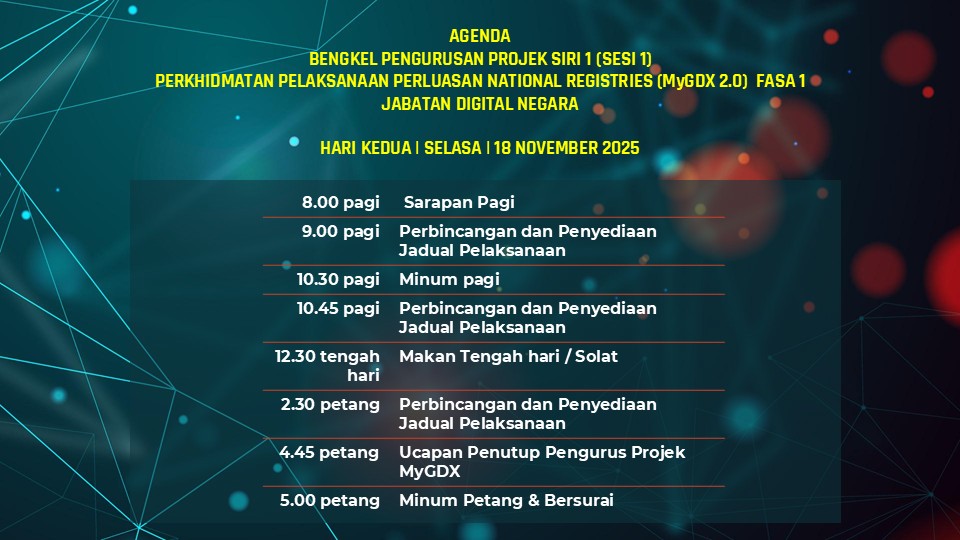 Sehubungan itu, sukacita dimaklumkan bahawa Bengkel Pengurusan Projek Siri 1 (Sesi 1) akan diadakan untuk menetapkan perlaksanaan projek Perkhidmatan Pelaksanaan Perluasan National Registries (MyGDX 2.0) Fasa 1.