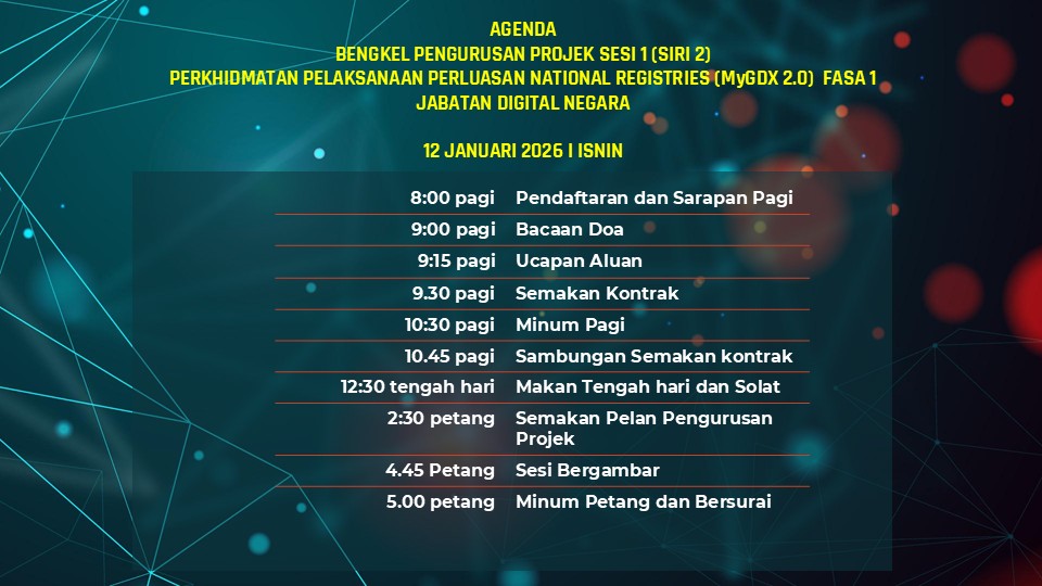Sehubungan itu, sukacita dimaklumkan bahawa Bengkel Pengurusan Projek Siri 1 (Sesi 2) akan diadakan untuk menetapkan perlaksanaan projek Perkhidmatan Pelaksanaan Perluasan National Registries (MyGDX 2.0) Fasa 1.