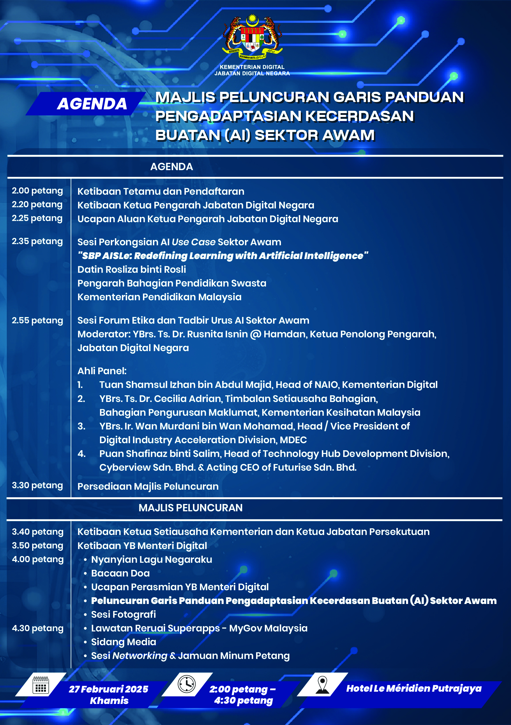 Sehubungan itu, JDN akan menganjurkan majlis peluncuran yang akan dirasmikan oleh YB Gobind Singh Deo, Menteri Digital dan YBhg. Tan Sri Shamsul Azri bin Abu Bakar, Ketua Setiausaha Negara. Bersempena majlis ini, Sesi Perkongsian AI Use Case Sektor Awam dan Forum Etika dan Tadbir Urus AI Sektor Awam turut diadakan.